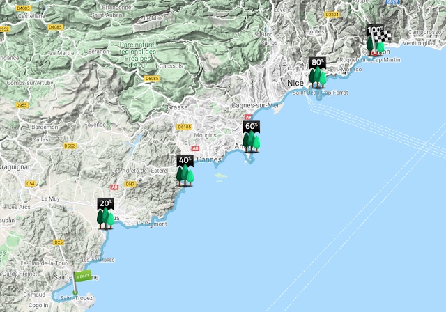The blue line indicates the completed route from Saint Tropez to Menton.
