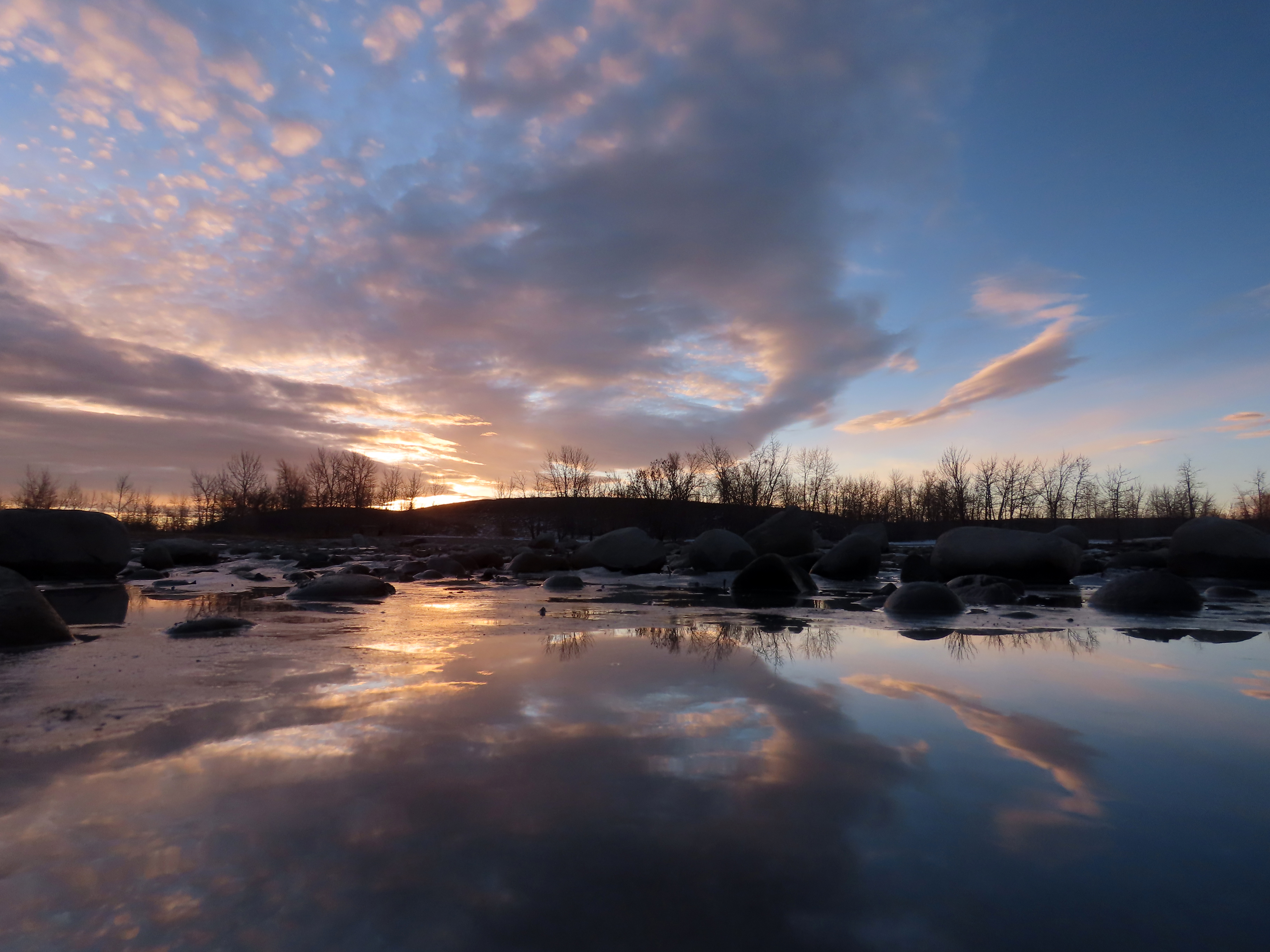 Today, it was time to lace up the skates again and etch my way to the finish line of the Estrada Real Challenge. After a Christmas Day visit to the Sanctuary yesterday where I walked roughly 7 kms, today I was in need of 7.1 kms yet I covered 10.27 kms, just because it was such a gorgeous morning to be in ice. I headed for the Ice Trail again and the groomer was just finishing up with his last round of flooding. The moon was setting between the trees while the sun was casting that pink hue over the river and onto the Ice Trail.